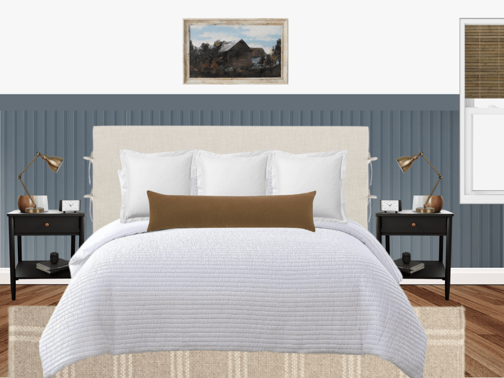 Taking inspiration from my sister’s sweet mid century ranch, I created this comfortable yet chic primary bedroom with only Target finds. The bead board behind the bed adds texture and cozies up the space in Sherwin Williams Slate Tile. Simple bamboo blinds, instead of curtains, keep the space casual and tie in the warm tones of the art, pillow, and floor.